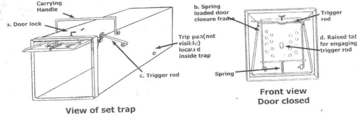 To set the trigger, lift bottom of trap door up and engage © trigger rod into (d) raised tab.